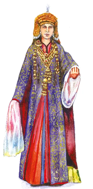 The clothes of women in the southern and northern regions of the oasis differed in details. The set of clothes consisted of a guinak undershirt-dress and ishton pants; outerwear elak (yalak) or misak (in the south), chapan (in the north), quilted on a thin layer of cotton wool; chapan quilted with embossed stitch; head capes burqa (in the south) and jegda (in the north), takhia for girls and young women, lachak (in the north) and bosh level (in the south), makhsa shoes, kavush.