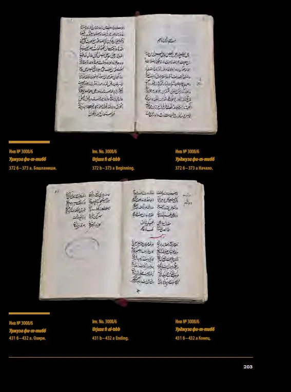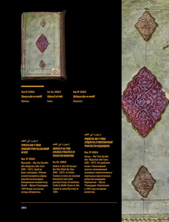 Three works by the great Central Asian scientist and encyclopaedist ‘Abu ‘Ali ibn Sina (980 – 1037) adorn the collection of medical books such as a manual on medicine written in verse in a rajaz metre in ‘Arabic and Persian titled “Urjuza fi al-tibb” (Urjuza [A Poem] on Medicine) in one manuscript of the 19th century; “Al-Masa’il al-ma’duda” (Selected Issues) includes fifteen questions on medicine and answers from Ibn Sina in the manuscript of the early 18th century; the famous encyclopedia in Arabic titled “Al-Qanun fi аl-Tibb” (The Canon of Medicine) is represented in seven manuscripts, among which two manuscripts are complete: a copy made in 1309 and a three-volume decorated manuscript supposedly of the 17th century.