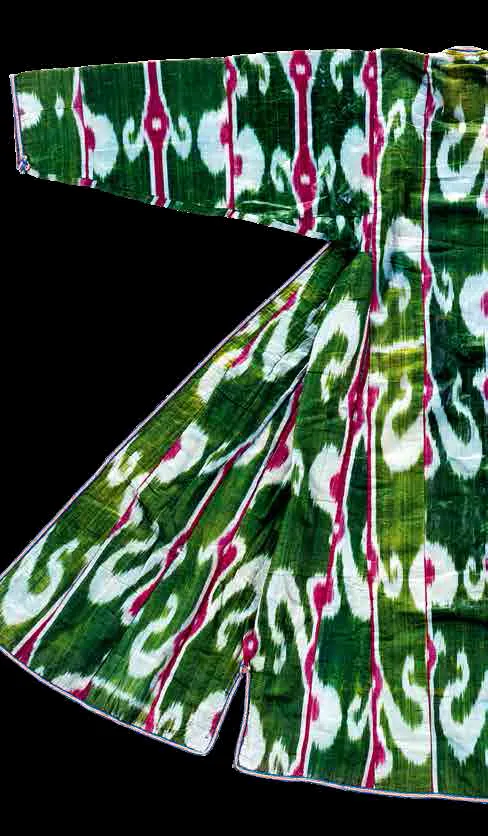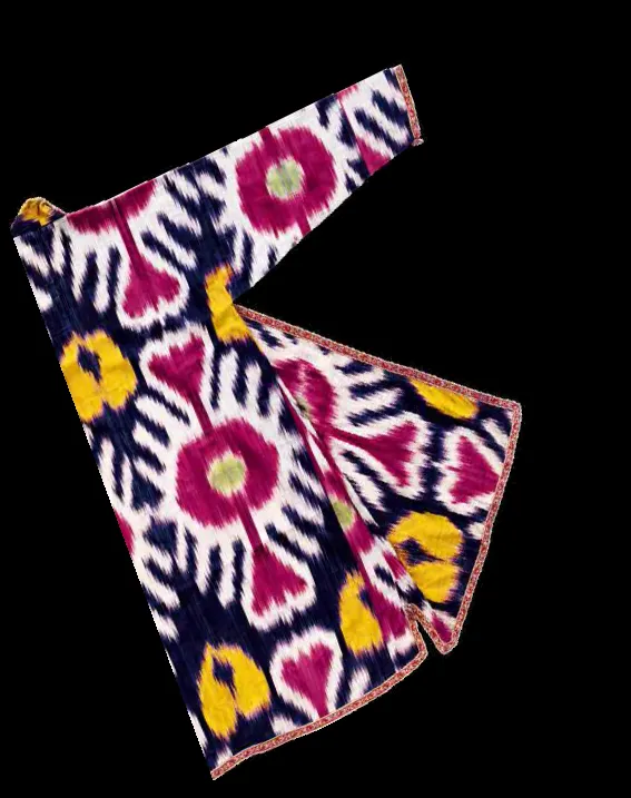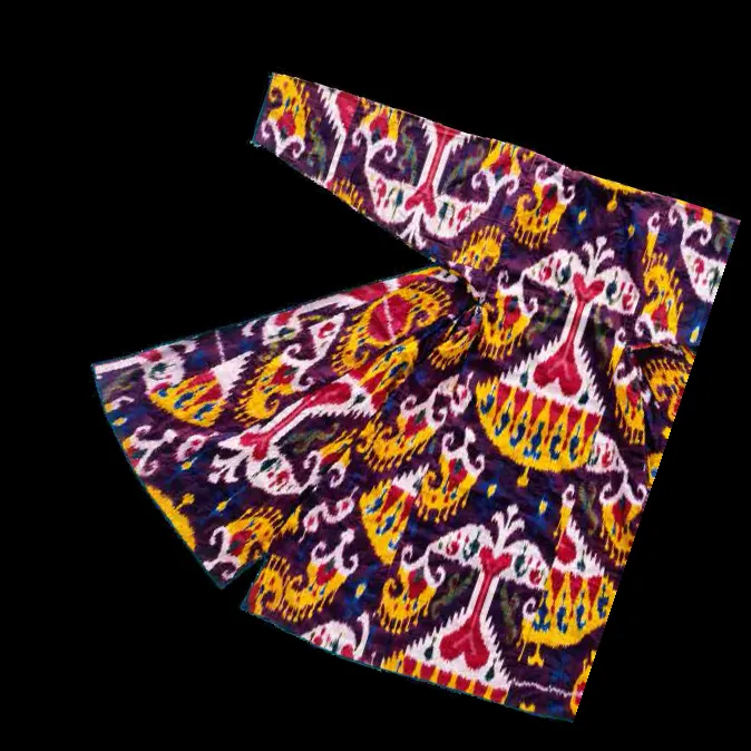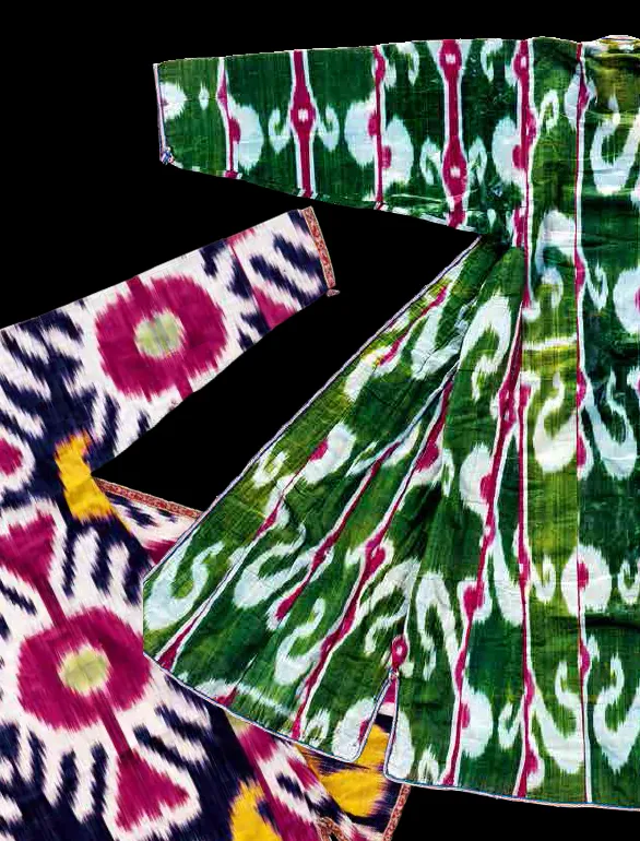 In Central Asia, in order to produce Ikat textile the warp threads were dyed before they were installed to the loom. For the joom, both silk and cotton yarn could be used. Thus, fabrics of different quality were made. To produce a shiny surface of the finished fabric, it was moistened with egg white, and then knocked out with wooden hammers.