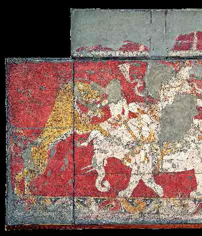 As we know, the murals of room 11 or the Red Hall are distributed among several museums. A scene depicting the attack of two leopards on a rider and a handler sitting on an elephant kept in the Museum of Arts decorated the western wall and was located on the left part of the wall. Only this scene preserved, at least in part, the face of the chief rider, finely painted by the artist, in which according to the outstanding researchers of the culture and art of Sogdiana A. M. Belenitsky and B. I. Marshak we see the already-familiar Adbag, the supreme deity of the Sogdians. A. I. Naymark, in turn, suggested that the iconography of the bodhisattva Samantabhadra, who loved riding around on an elephant, could serve as a prototype to the image, and here is most likely depicted the Lord of the South who is another character of Buddhist mythology.