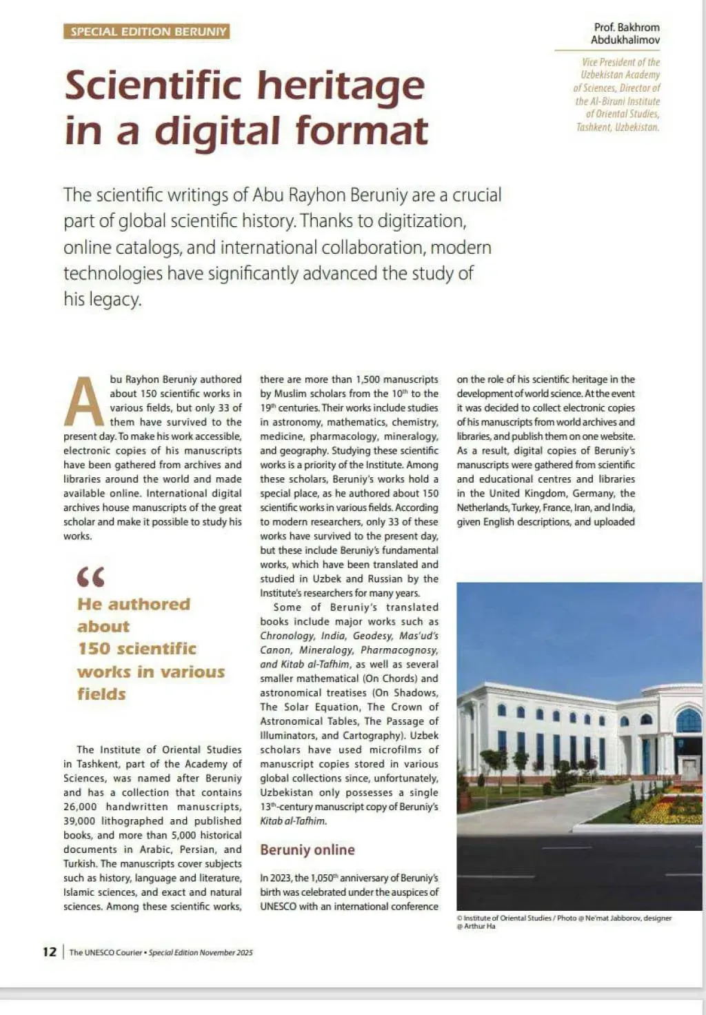 On this basis, a special digital "Beruni Collection" was formed in the institute's manuscript fund. An article titled "Scientific heritage in a digital format" by the institute's director, Professor Bahrom Abduhalimov, about the work carried out within the framework of the project, was published in The UNESCO Courier journal.