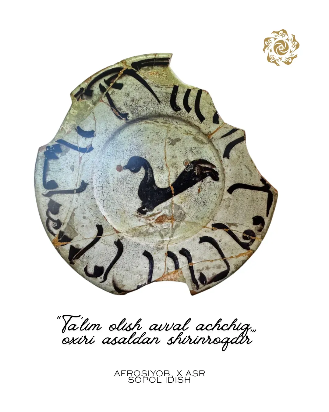Some inscriptions had a didactic character, for example, in the center of a round plate was depicted a stylized horse shape, and along the circumference of the vessel, the following inscription was written in Arabic: "Learning is bitter at first, sweet at last".
