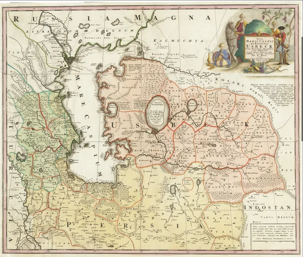 The map "Caspian Sea and the Uzbek Country" by Abraham Maas, published in Nuremberg in 1735, is of particular importance in European cartography due to the open and independent use of the name Uzbekistan. In it, under the name "Usbeck," the oases of Khiva, Bukhara, Samarkand, Fergana, and Turkestan are described as a single territory. This circumstance testifies to the fact that in the 18th century European science began to perceive Uzbekistan as an independent, specific geographical and political space.