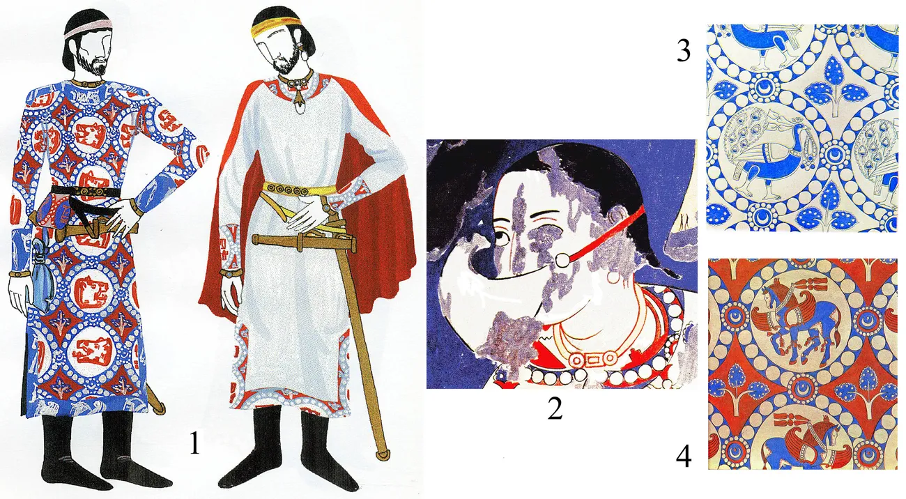 In the VII–VIII centuries, the ideal of beauty for both sexes was rather narrow clothes, emphasizing the figure.Large items of clothing (shirts, dresses, trousers) usually had a basic background of red, white or yellow. The most expensive and fashionable multicolored silks with complex patterns or from several shades of the same color (imported and Sogdian) usually form a border around the edges; only rarely do sovereigns and families of the highest nobility have clothes entirely made up of them.