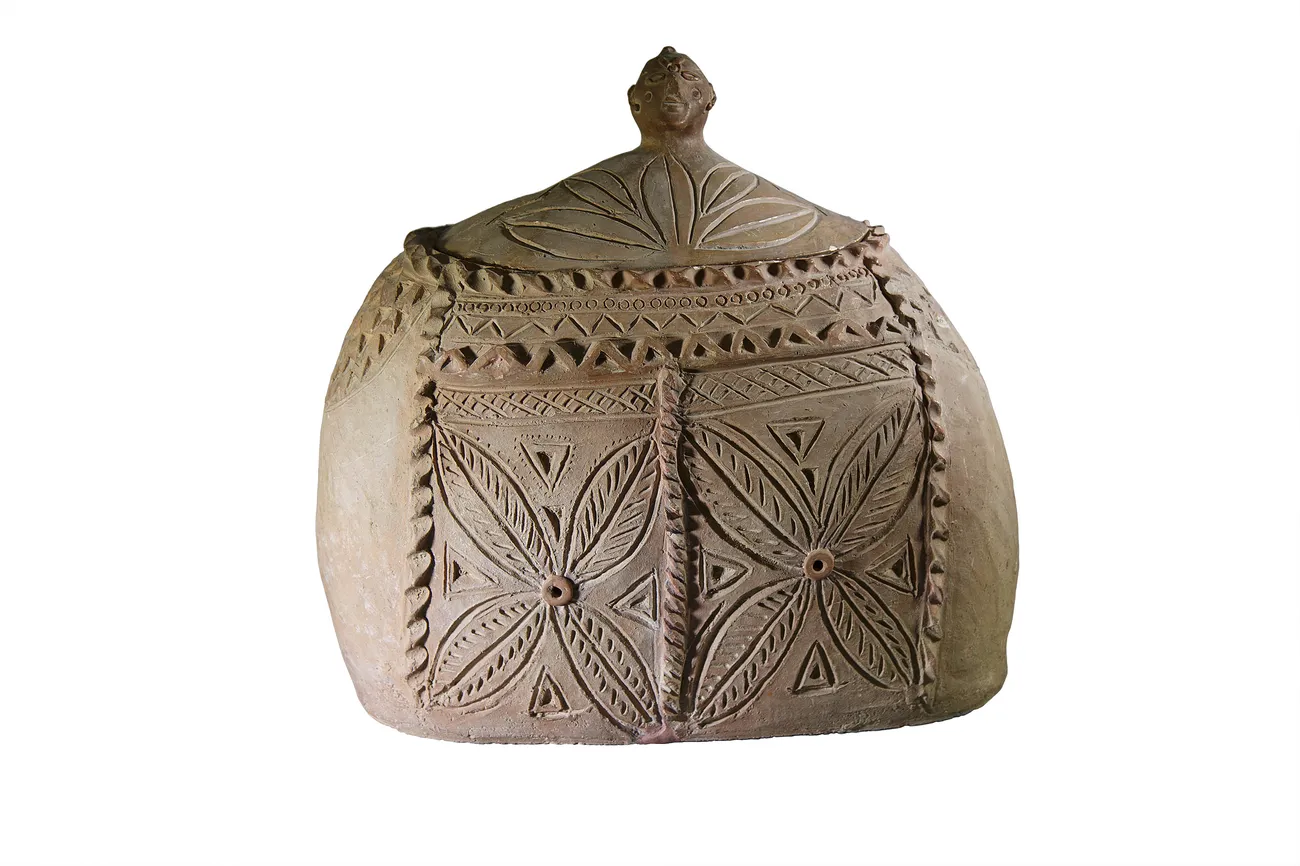 Clay sculpture with coloring of the V century from the settlement of Kuyovkurgan is psychologically expressive and professionally executed. Among the original monuments of this period are ossuaries or astodans - special cult ceramic ossuaries used in the funeral rites of fire worshipers. In accordance with these customs, after death, the body of the deceased was taken out to the platforms (dakhma) in order to specially learned dogs or birds cleaned it of meat, and then the bones were put in ossuaries and placed in special burial chambers - nauses. The first ossuaries in the region appeared in the 3rd-2nd centuries BC (Khorezm) and became widespread until the conquest of Central Asia by the Arabs in the VII-VIII centuries. In Khorezm, the so-called statuary ossuaries were widespread in the form of a rectangular or oval box, the top of which was decorated with a sculpture of a man or woman.