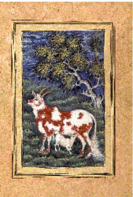 A paired two-page composition depicting a doe and a cow feeding their cubs could have had a multi-layered interpretation. The doe could not only be a reminiscence of a constant character in Persian poetry, but first of all, an allegory of an Iranian mother, in contrast to the Indian wet nurse in the form of a cow, an animal revered in India as sacred. Thus, Hamida herself could be represented in the image of a sacred cow -banu, symbolizing the idea of motherhood and unconditional love.