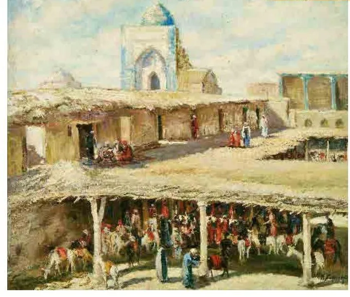 The ground-floor rooms were leased, as a rule, by more prosperous traders. In the caravanserai they kept stocks of goods and made trade deals. The rooms served as a resting place and a place for namaz. The courtyard depicted in Sidorenko’s painting conveys very accurately the originality of Bukhara’s caravanserai.