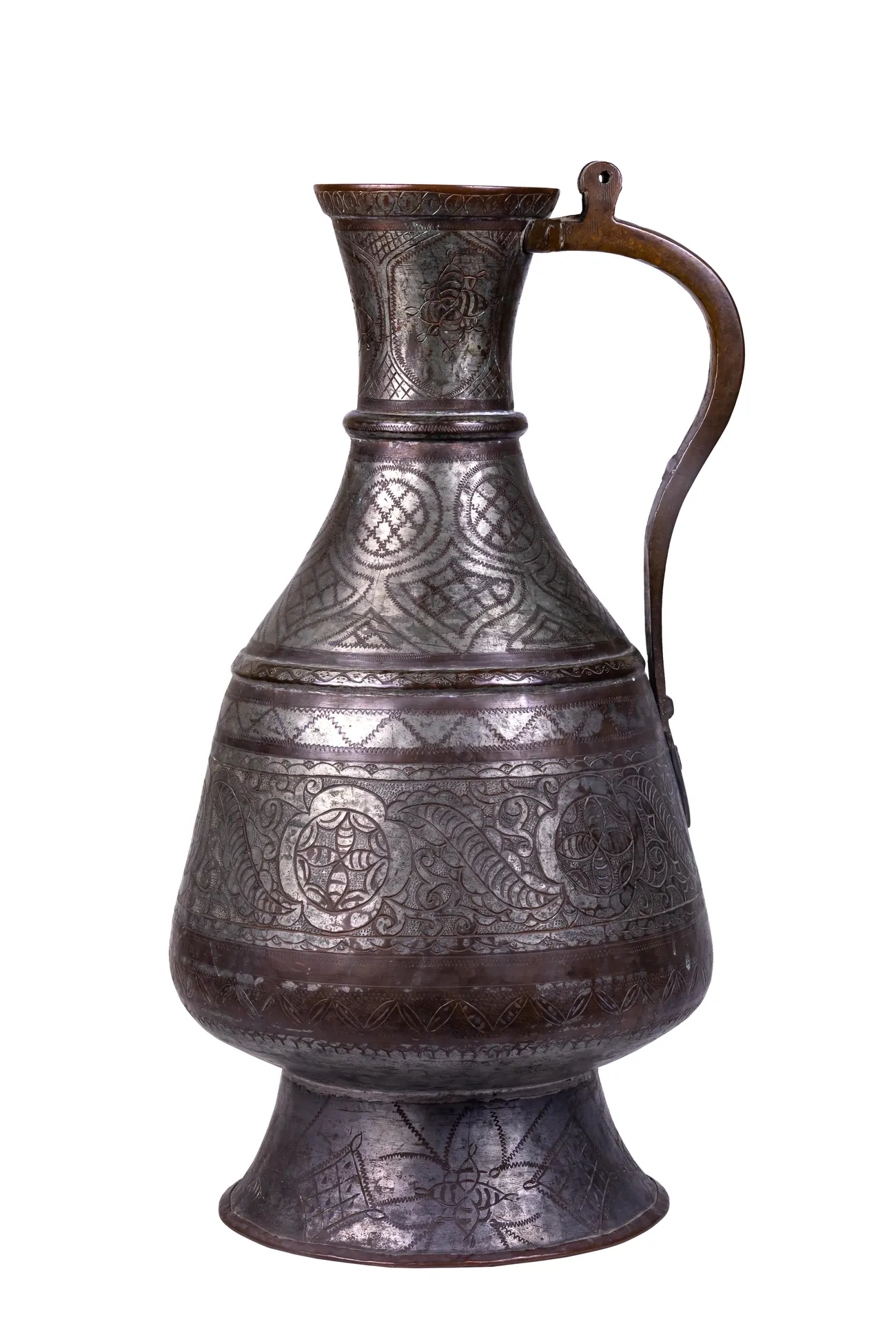 Products of the 19th – early 20th centuries are diverse in their shapes and purpose in everyday life. Especially widespread are graceful jugs for water and tea decorated with a rich pattern, which have different names and differed in silhouettes and shapes, all kinds of bowl-shaped vessels for water, milk, fruit juices and drinks, sweets and fruits, basins for washing and spittoon, round and rectangular trays, stands for warming-up bread, lid for covering food, mugs and ladles. Hunting drums, cash desks for storing merchants‘ proceeds, jewelry chests, pencil cases, smoking devices and ritual incense holders, lamps and candelabra are distinctive in their shapes and engraved patterns. The decoration of miniature cosmetic and perfumery devices required the filigree technique.