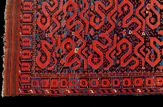 The pile carpets of Karakalpaks, along with those of Turkmen, contain dominating features such as medalion-gol, with a distinctive diagonal pattern. But unlike Turkmen items, Karakalpaks’ gols have simpler patterns, and there is no discernible tribal meaning. All in all, Karakalpaks’ carpets are decorated in a very concise manner, with the following elements dominating: simple and stepped diamonds, squares, octangles, triangles, zoomorphic (horn and claw-like), S-signs, and broken lines, i.e. the most archaic elements typical for steppe art and a feature of all carpets made by peoples who used to lead a nomadic existence. Semi-abstract plant motifs like the tree of life can be seen on yurt straps, or baskurs. The palette is based on a contrasting combination of red, brown and black (main) shades. By varying the ratio of colors and their shades, women managed to achieve a variety of artistic solutions.