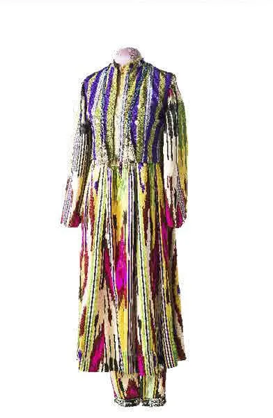 Xon-atlasdan tikilgan kostyum o‘zbek milliy kiyimining boy to‘qimasi va yorqin ranglarini namoyon etadi. Yig‘ma beqasam bilan bezatilgan kamzuli o‘zining nafosati va dinamik obrazi bilan o‘zbek to‘qimachiligi anʼanalarini va mahoratini aks ettiradi.