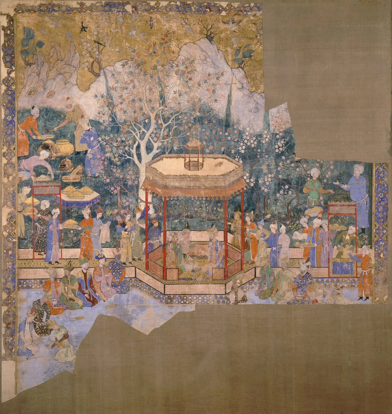 Miniatyura nozik paxta matosiga ranglar va oltin bo‘yoqlar bilan ishlangan. Saqlanib qolgan qismida bog‘ pavilyonida o‘tirgan, Markaziy Osiyo uslubidagi libos kiygan hukmdor tasvirlangan. Uning ikki yonida xizmatkorlar turibdi, u esa ro‘parasidagi mehmon tomon yuzlanmoqda. Ikki tomonida saroy amaldorlari joylashgan, orqa fonda ham xizmatkorlar ko‘rinadi. Miniatyuraning hozir mavjud bo‘lmagan old fonida, ehtimol, raqqosalar va musiqachilar tomonidan ijro etilayotgan saroyona ko‘ngilochar dastur aks ettirilgan. Miniatyurani sanʼatshunos J.M.Rogers XVI va XVII asrlarda Hindistonda rivojlangan islomiy tasvir sanʼatining bir ko‘rinishi sifatida taʼriflagan.