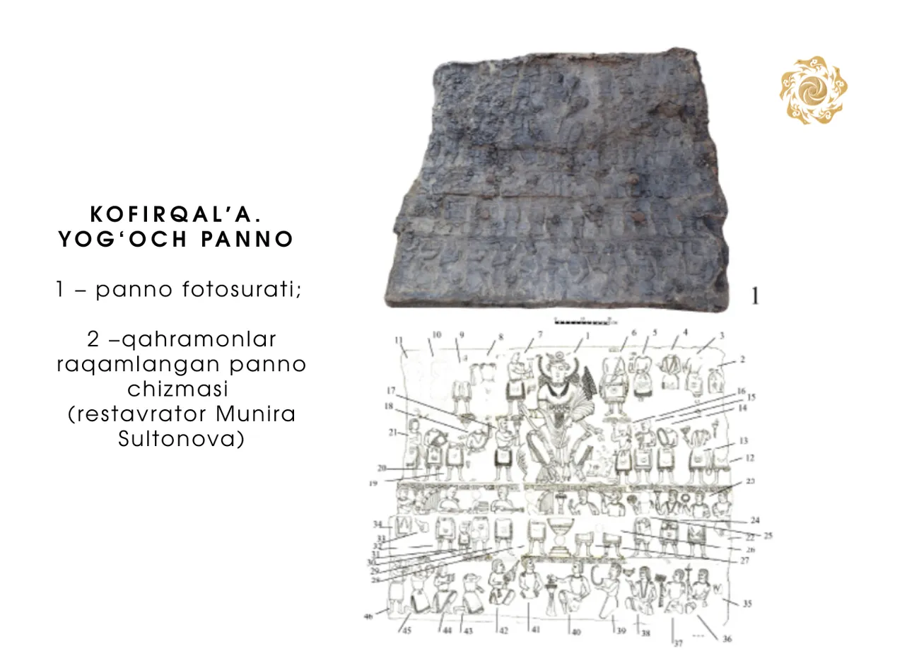 O‘lchami, syujetlari kompozitsiyasi va nisbatan yaxshi saqlanganligiga ko‘ra noyob sanalgan to‘g‘ri burchakli yog‘och panno alohida qiziqish uyg‘otadi. Pannoning o‘zi ikkita keng taxtadan iborat bo‘lib, ular temir bandlar bilan bir-biriga biriktirilgan. Taxtalarning hozirgi kundagi qalinligi 1 santimetrga yetmaydi.