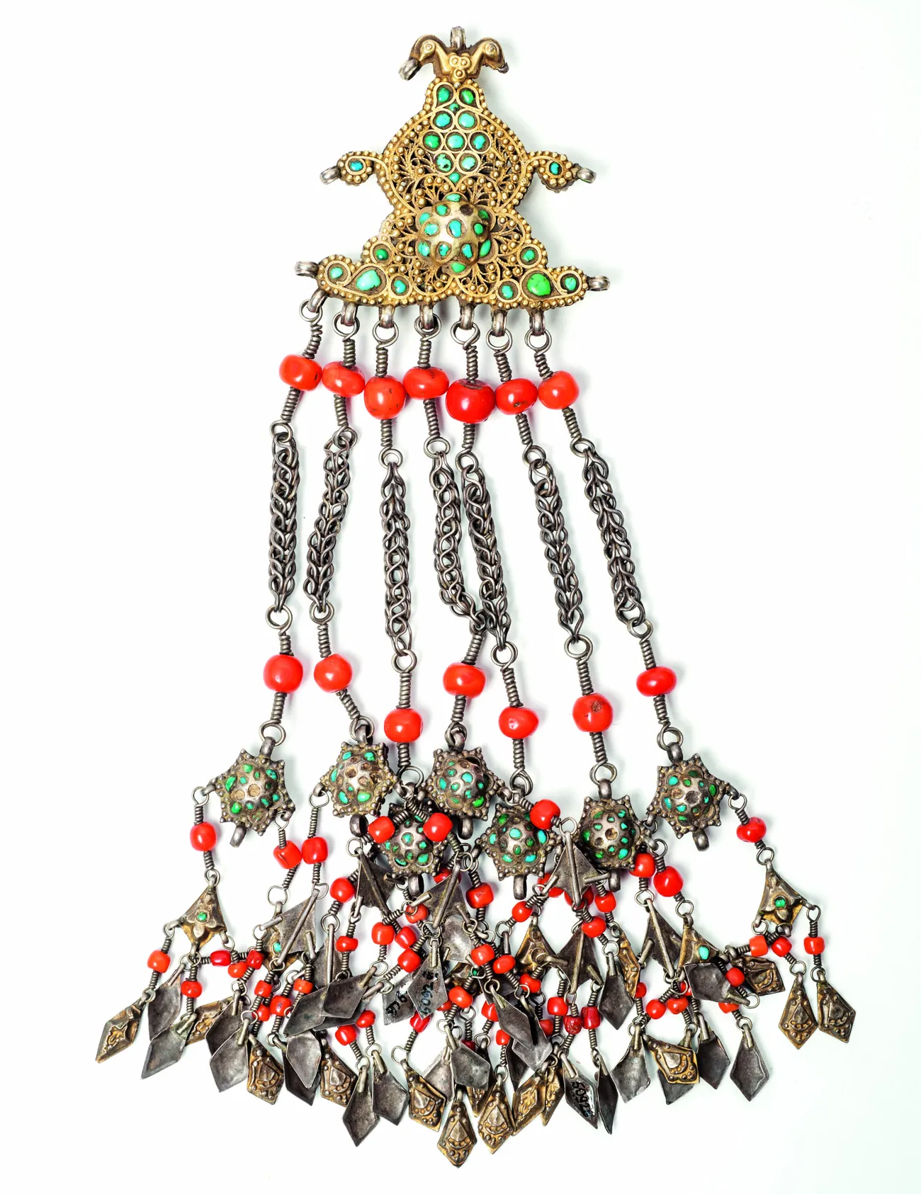 Bezaklar o‘ziga xos o‘ta nafis o‘ymakor shaklli plastina yoki gumbazcha shaklida bo‘lib, ularga kalitlar yoki pardoz anjomlari mahkamlab qo‘yilgan. Ulardan ba'zilari 1946 yilgi ekspeditsiya tomonidan xarid qilingan, boshqalari V.A. Razvadovskiy, A.I. Smirnov, M.N. Xalaminskaya tomonidan yig‘ilgan kollektsiyalardan kelib tushgan.Ushbu osma zeb-ziynatlar qadimgi paytlarda soch turmak usti bezaklari sifatida ishlatilishi mumkin edi. Keyinchalik vazifasi o‘zgarib, ular ko‘krakka taqiladigan bo‘lgan.